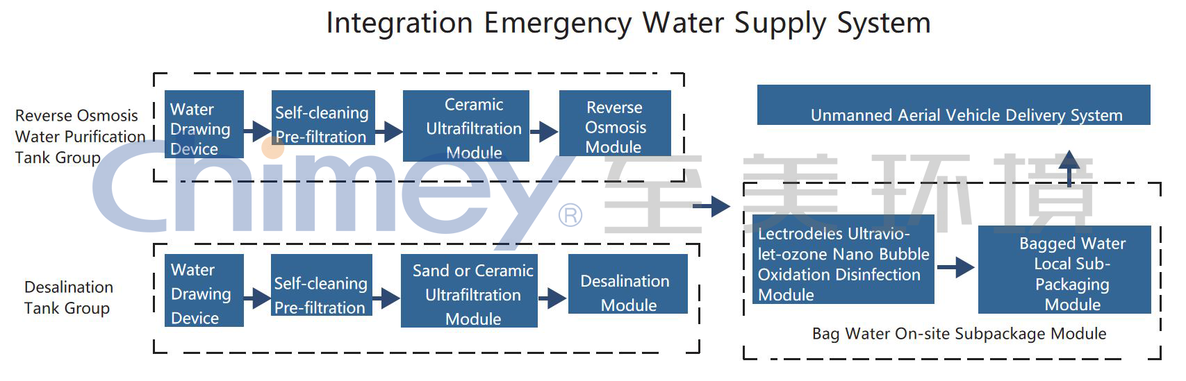 The deep purification and packaging module enhances water to direct drinking standards, filling it into portable bags for convenient transport via unmanned delivery systems.
