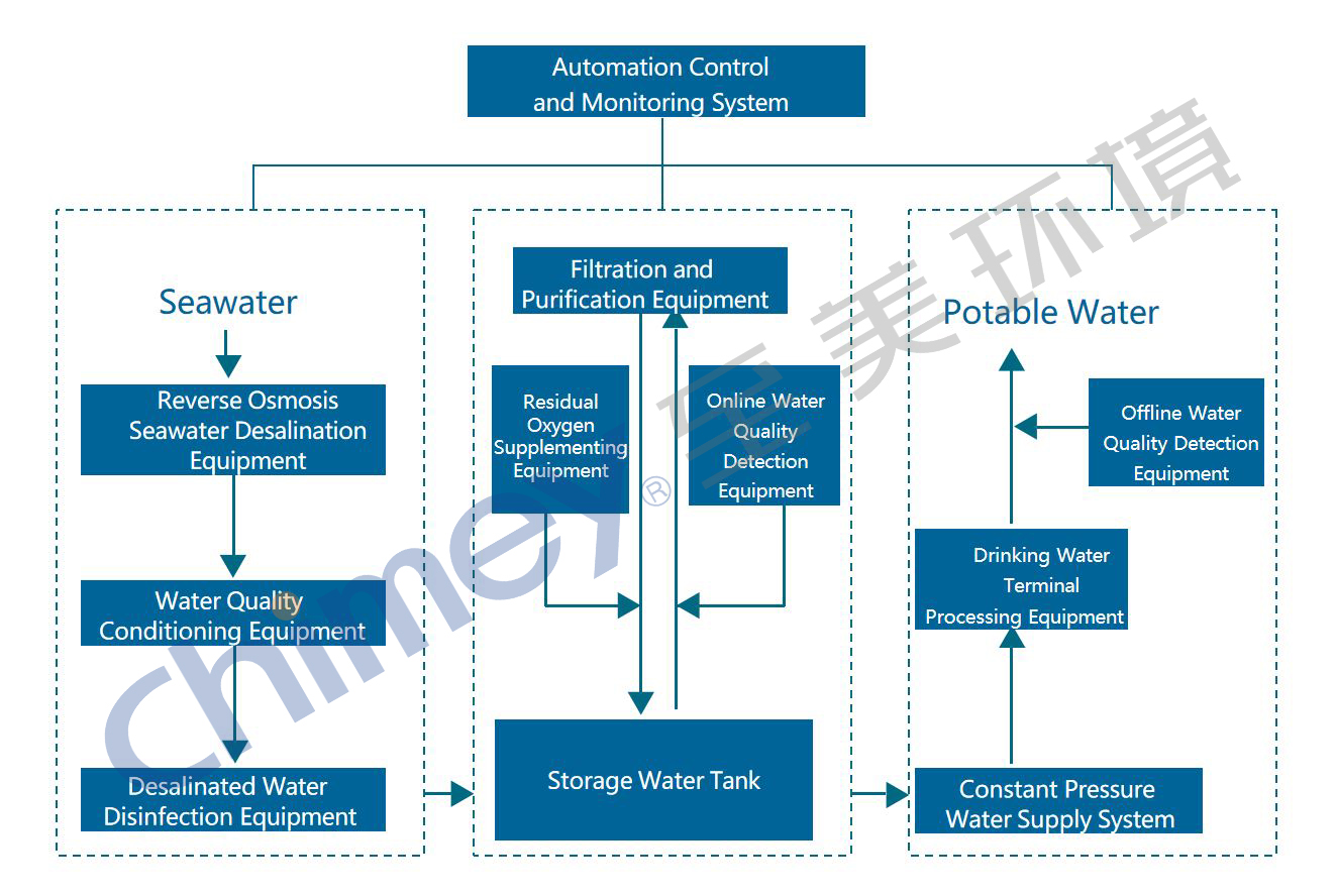 Shipboard & Island Seawater Desalination Systems cover the full process of water production, storage, and distribution. The system integrates RO desalination units, water conditioning systems, disinfection and chlorination units, filtration and purification modules, terminal treatment units, and water quality monitoring equipment.